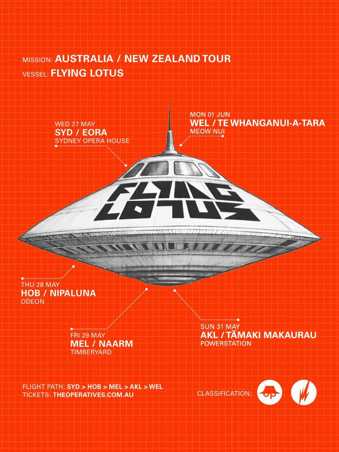 Flying Lotus - Australian Tour 2026 Flying Lotus - Australian Tour 2026Wed 27 May 2026 – Sydney Opera House – Sydney, NSW - TicketsThu 28 May 2026 – Odeon Theatre – Hobart, TAS - TicketsFri 29 May 2026 – Timber Yard – Melbourne, VIC - Tickets Toursaustralianmusicscene13 April 2026May 2026