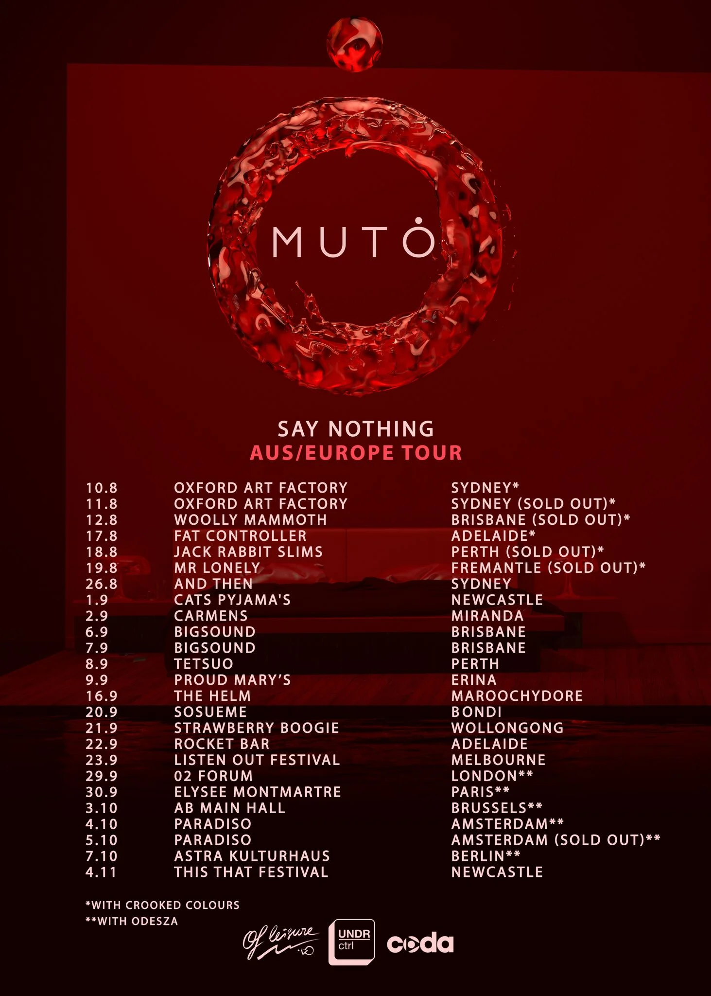 Currently on tour with Crooked Colours and in line with the release of the new single, MUTO is embarking on a giant run of shows across Australia and Europe. Recently announced on both triple j Unearthed BIGSOUND showcases and with appearances set for This That Festival and Listen Out Melbourne, MUTO's mammoth 30-date run also includes Odesza's ‘A Moment Apart’ European album tour, which he was personally handpicked to support by the electronic powerhouse.